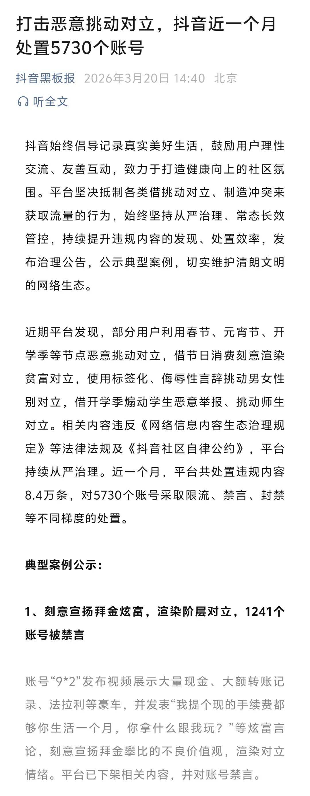 部门账号借节日消费锐意衬着对立,利用标签化、性言辞挑动男女性别对立,借开学季学生恶意举报、挑动师生对立。相关内容违反《收集消息内容生态管理》等法令律例及《抖音社区自律公约》,平台持续从严管理。具体来说,锐意拜金炫富,衬着阶级对立,1241个账号被禁言。好比账号“9*2”发布视频展现大量现金、大额转账记实、法拉利等豪车,并颁发“我提个现的手续费都够你糊口一个月,你拿什么跟我玩?”等炫富言论,锐意拜金攀比的不良价值不雅,衬着对立情感。平台已下架相关内容,并对账号禁言。其实抖音电商这几年的成长众目睽睽,抖音平台曾经不只仅是一个“刷视频打发时间”的处所了,它曾经逐渐成长成一个分析性的平台。此前,有透露抖音电商的GMV或将打破4万亿大关。这个别量意味着平台必需认实整治内容,以推进贸易化成长。从久远来看,网红达人们选择这种杀鸡取卵的做法,不只面对随时被封禁的风险,还了平台的内容生态。当然,此次整治规模之大可见抖音是动实格了,这也给网红达人们了一个强烈的信号:靠销售焦炙、制制对立来收割流量的子必定是走欠亨的。现实上,此前,有不少网红大V曾因炫富、对立博流量被,但仍是有网红剑走偏锋,了不异的结局。“专科生是学历”“月入5000的人不配和我对话”。。。。。。这些令人瞠目结舌的言论,均出自坐拥百万粉丝的网红户晨风之口。