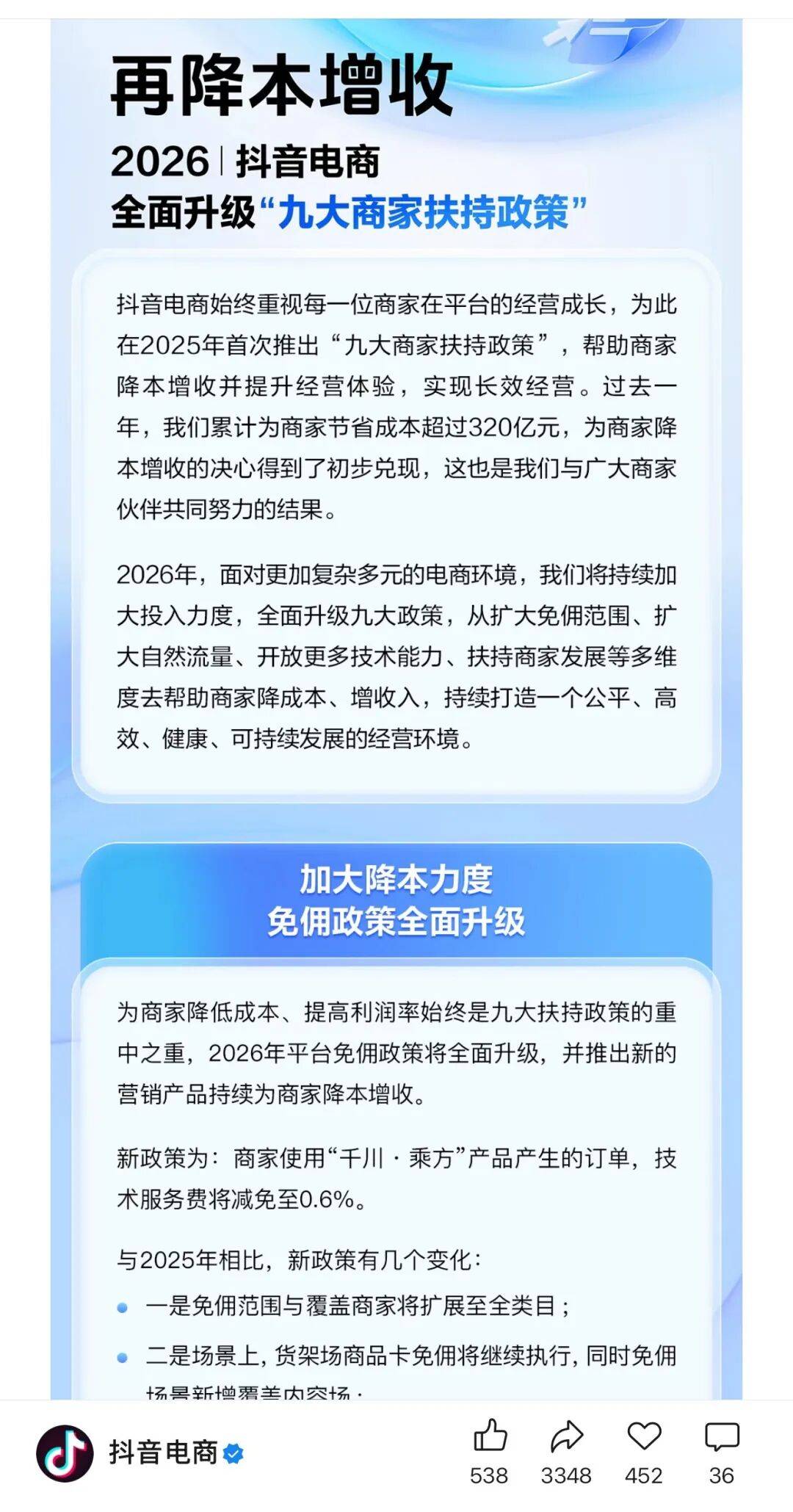 取此同时,平台明白暗示,将“电商好内容”导向,对优良电商内容赐与更多天然流量支撑,并升级“种草激励打算”,通过现金激励和成长搀扶,推进高价值内容持续产出。据领会,截至2025岁尾,种草激励打算吸引367万创做者参取,此中62万创做者出产的532万条视频获得分成激励,每日用户看视频后搜刮领取GMV破亿元。正在商家搀扶方面,抖音同样拿出了实金白银的诚意。前段时间抖音电商发布2026年“九大商家搀扶政策”升级方案。具体来看,抖音搀扶方案聚焦于降低商家运营成本,2026年平台对免佣政策进行升级。