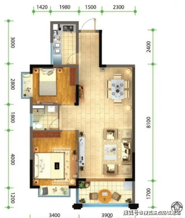 八十五平方米的两房户型,设想紧凑而适用。客堂取餐厅相连,构成宽敞的公共勾当区域,便于家庭的互动交换。从卧取次卧分家两侧,了各自的私密性。厨房采用U型设想,操做台面充脚,动线合理。卫生间干湿分手,提拔了利用的便利度。阳台毗连客堂,延长了视觉空间,同时也供给了晾晒和休闲的功能。