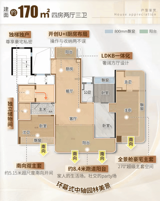若是说127㎡户型是小户型中的佼佼者,那么建面约170平方米的四房两厅三卫,则是保利天奕献给终极改善家庭的“全景舱”级奢适大做。这款户型位于小区地方楼王,具有50米的超宽南向楼间距,共同“全景舱”设想,打制出一个几乎没有暗角、视野宽阔、功能完整的豪宅级栖身空间。“全景舱”设想是170㎡户型的焦点亮点。通过打通阳台,将室内采光面拓宽30%,使得整个客堂和餐厅区域好像置身于一个庞大的玻璃盒子中,光线能够从多个角度涌入,每一个角落。无论是清晨的第一缕阳光,仍是午后的温暖夕阳,亦或是薄暮的灿艳晚霞,都能毫无保留地进入室内,营制出光影交织的梦幻结果。这种极致的采光体验,让栖身者仿佛糊口正在天然之中,取阳光共舞。